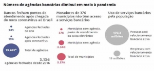 Quase metade das cidades não tem uma agência (2.340), o equivalente a 42% do total de 5.570 municípios. Neste ano, segundo o Banco Central, sete cidades ficaram sem um banco —duas delas durante a pandemia (entre março e abril).