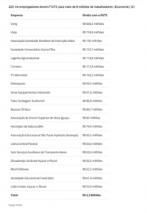 Segundo levantamento feito pelo G1 com dados da PGFN, as 20 empresas com as dívidas mais altas somam cerca de 7% do valor total atrasado que é devido ao FGTS, com R$ 2,302 bilhões. A maior parte delas está falida ou em recuperação judicial, como Varig, Vasp, Busscar Ônibus, Sociedade Universitária Gama Filho e Laginha Agroindustrial.