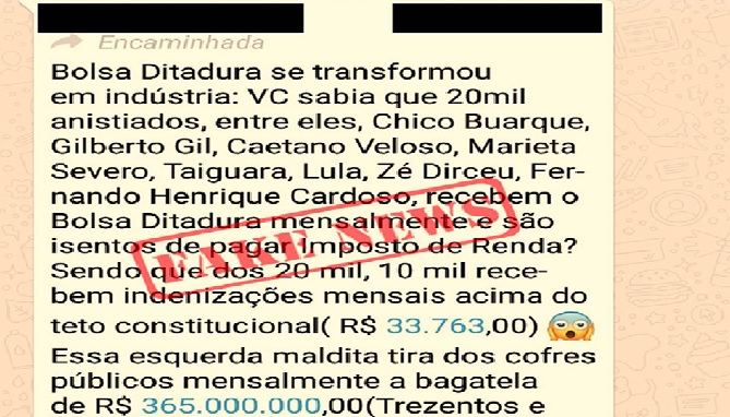 Essa fake news envolve além de políticos, grandes nomes da música brasileira! Postagens no Facebook que viralizaram também no Whatsapp afirmam que 20.000 anistiados após o término da ditadura militar brasileira recebem o benefício “Bolsa Ditadura” e de quebra estão isentos de pagar imposto de renda. Entre eles estão Fernando Henrique Cardoso, Caetano Veloso, Lula, Taiguara e Marieta Severo. Falso.