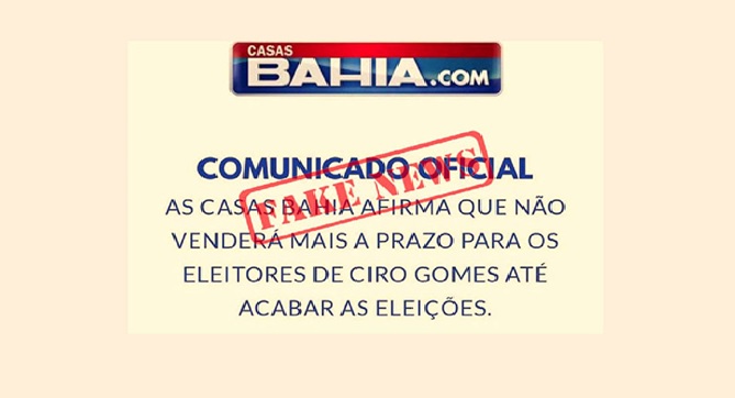 O brasileiro adora comprar a prazo. Uma das propostas do Ciro Gomes propõe limpar o nome da população do Sistema de Proteção ao Crédito, o temido SPC. Logo, segundo esta fake news, para se prevenir a rede Casas Bahia, um dos paraísos da venda parcelada no carnê, teria proibido a venda a prazo para eleitores do pedetista. Algo que, claro, nunca aconteceu.
