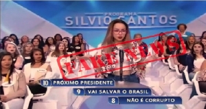 “Ma oê!”. Bolsonaro no programa do Silvio Santos? Foi o que essa imagem trouxe para o cardápio de notícias mentirosas. Nas três dicas para que uma participante da prova adivinhasse o nome de um personagem foram inseridos digitalmente “próximo presidente”, “vai salvar o Brasil” e “não é corrupto”. As dicas originais eram “foi do Exército”, “mudou o regime” e “15 de novembro”, referindo-se ao general João Batista Figueiredo. A plateia chutou o nome de Bolsonaro – e isso não é fake news…