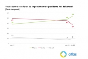 Pesquisa Atlas Político, feita com 2.000 pessoas entre os dias 24 e 26 de abril, e divulgada nesta segunda-feira (27) pelo jornal El País, aponta que 54% dos brasileiros são a favor do impeachment de Jair Bolsonaro. É a primeira vez que mais da metade dos entrevistados apoia o impedimento de Bolsonaro no levantamento feito pelo instituto. Apoio vem na esteira da demissão de Sérgio Moro do Ministério da Justiça.