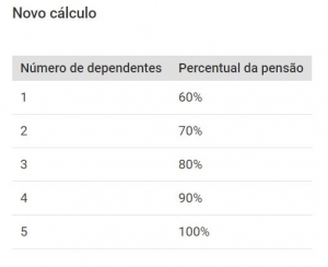 Com a reforma, o pagamento será de 50% do benefício, mais 10% por dependente, até o limite de 100%. A viúva é considerada uma dependente. Se ela não tiver filhos menores, receberá 60% da aposentadoria do marido