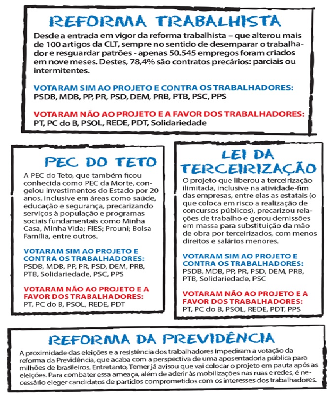 Para orientar os trabalhadores na escolha de Deputados Federais e Senadores, vários Sindicatos de Ponte Nova, Viçosa e Região distribuíram um folder que mostra a forma como votaram os congressistas mineiros em 4 temas que afetam diretamente os trabalhadores e a democracia.