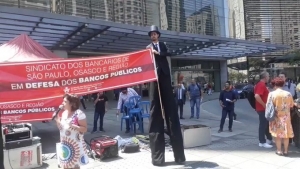 Em São Paulo, dirigentes fizeram reuniões em locais de trabalho e panfletagem no Metrô para denunciar a política de desmonte dos bancos e demais empresas públicas; atividade se encerrou com protesto lúdico em frente a shopping de grande circulação na Avenida Paulista