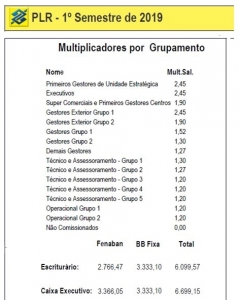 O Banco do Brasil divulgou na manhã desta ultima sexta-feira 30 a tabela com valores da Participação nos Lucros e/ou Resultados referente ao primeiro semestre de 2019, que foram pagos nesta sexta-feira 30 aos funcionários. Os valores totais por cargo são de R$ 6.099,57 para escriturários e R$ R$ 6.699,15 para caixa executivo.