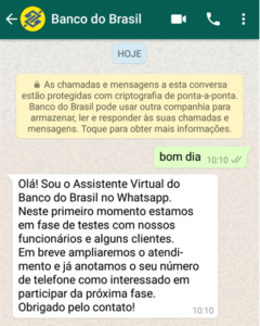 Recentemente, o BB passou a experimentar o mesmo tipo de atendimento através do WhatsApp. Os testes começaram sem alarde na última terça-feira (22), segundo a ANABB (Associação Nacional dos Funcionários do Banco do Brasil).