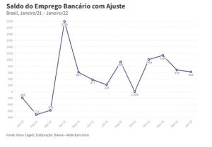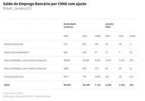 Os bancos têm apresentado saldo positivo de empregos desde abril de 2021. No acumulado de 12 meses (fevereiro de 2021 a janeiro de 2022), foram criados 7.711 postos de trabalho, decorrentes principalmente das contratações da Caixa – devido a ação judicial vitoriosa do movimento sindical bancário, que obrigou a Caixa a chamar os concursados de 2014 – e da ampliação de postos não ligados diretamente aos serviços bancários, como o de profissionais de TI.