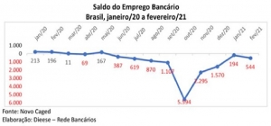 Os piores saldos do setor bancário, entre janeiro de 2020 e fevereiro de 2021, foram registrados nos estados de São Paulo (-3.285), no Rio Grande do Sul (-1.807) e no Rio de Janeiro (-1.594). Apenas os estados do Acre e Pará apresentaram resultados positivos.