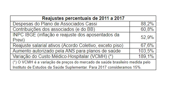 Na tabela abaixo constam dados retirados dos relatórios anuais da Cassi e de outras fontes. As contribuições normais dos associados (e do BB) aumentaram mais que a inflação, graças aos aumentos reais de salários conseguidos pela ação sindical. As despesas com assistência médico-hospitalar cresceram muito mais, devido às exigências dos prestadores de serviço credenciados. No entanto, as despesas da Cassi cresceram bem menos que o custo do mercado de saúde e as contribuições aumentaram menos que a Agência Nacional de Saúde Suplementar (ANS) autorizou para os planos de saúde.