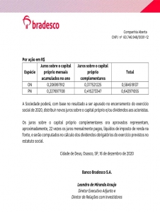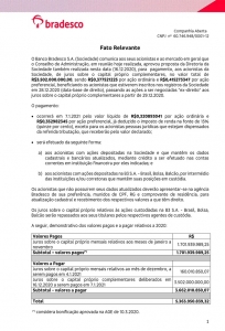 O conselho de administração do Bradesco aprovou o pagamento de R$ 3,5 bilhões em juros sobre o capital próprio complementares, mostra documento enviado ao mercado nesta quarta-feira (16). (Por Renan Dantas)