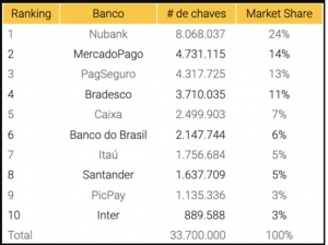 O ranking, que contou com dez bancos, deixou o Bradesco em 4º lugar, com 3.710.035 chaves, Banco do Brasil em 6º, com 2.147.744 chaves, Itaú em 7º com 1.756.684 e Santander em 8º, com 1.637.709.