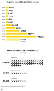 O Brasil registrou uma explosão de registros de CACs no país com o governo Bolsonaro.  Em 2020, houve um recorde de certificados concedidos: mais de 100 mil, um aumento de mais de 40% em relação ao ano anterior — que já havia marcado um recorde histórico.