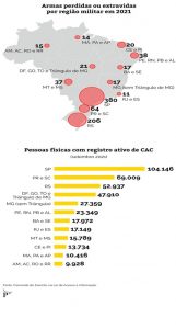 A maior quantidade de armas roubadas ou extraviadas no Brasil foi registrada na região militar correspondente ao estado de São Paulo: foram 380 apenas em 2021. São Paulo é justamente a região com mais registros de CACs em todo o país. São mais de 104 mil pessoas físicas com registro ativo, informados pelo Exército em setembro de 2021.
