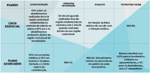 O novo plano também sai mais caro para o bolso do conveniado, em relação aos outros. Para começar, o Cassi Essencial não conta com o patrocínio do BB, ao Contrário do Plano Associados que tem o Banco como patrocinador, inclusive na aposentadoria.