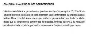 Conforme a Cláusula 18 da CCT 2020-2022, estendem-se aos empregados ou empregadas que tenham filhos com deficiência que exijam cuidados permanentes idênticos reembolsos e procedimentos previstos na Cláusula 17, sobre Auxílio Crache/Babá, porém, sem limite de idade. A condição precisa ser comprovada por atestado fornecido pelo INSS ou instituição por ele autorizada, ou, ainda, por médico pertencente a Convênio mantido pelo banco. Confira: