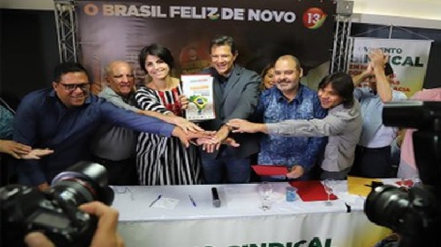 Haddad, Manuela e sindicalistas, em ato para selar unidade contra candidato que aprovou reformas contrárias aos trabalhadores