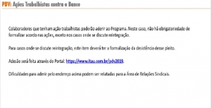 O Banco Itaú encaminhou à Contec, nesta manhã (30/07), as regras e critérios para adesão ao Plano de Desligamento Voluntário (PDV). Confira quem pode participar: