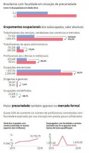 Levantamento feito pela Folha, com foco apenas no mercado formal, descortina uma outra tendência de inserção precária dos profissionais qualificados no mundo do trabalho. Trata-se da busca de refúgio de muitos desses trabalhadores em postos que exigem menos anos de escolaridade e menos qualificação.