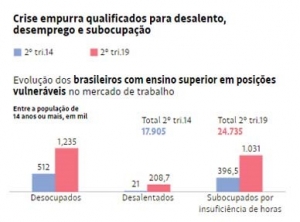 Segundo dados levantados pelo IBGE a pedido da Folha, a fatia da população com ensino superior completo que está desempregada, desalentada ou trabalhando menos horas do que gostaria saltou de 930 mil para quase 2,5 milhões entre o segundo trimestre de 2014 e o mesmo período deste ano.