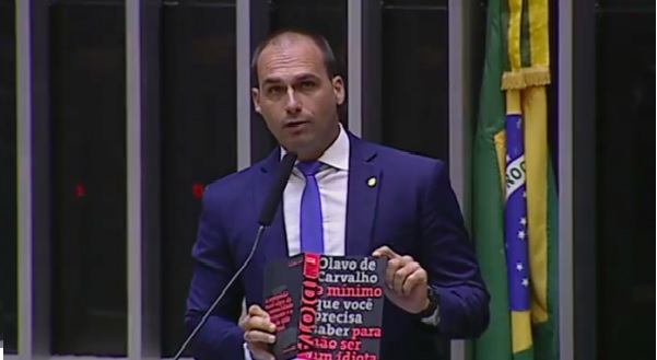 Com um livro de Olavo de Carvalho nas mãos, o deputado Eduardo Bolsonaro (PSL) foi ao plenário para se dizer contrário à realização da sessão solene e manifestou total repúdio à pessoa de Karl Marx.