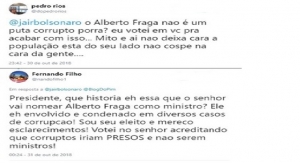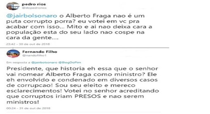 Boa parte das críticas miram a nomeação de Alberto Fraga, condenado, em setembro deste ano, por concussão, ou seja, uso do cargo público para obter vantagem indevida. “O Alberto Fraga não é um puta corrupto? Eu votei em você para acabar com isso (…) A população está do seu lado, não cospe na cara da gente”, tuíta um internauta mencionando Jair.