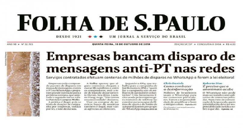 Reportagem de Patrícia Campos Mello, na Folha de S.Paulo desta quinta-feira (18), revela que um grupo de empresários – entre eles Luciano Hang, dono da Havan – está contratanto empresas para disparar fake news contra o PT para a campanha de Jair Bolsonaro (PSL). A prática é ilegal, pois se trata de doação de campanha por empresas, vedada pela legislação eleitoral, e não declarada.