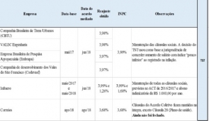Para essas empresas, o resultado foi um reajuste inferior ao INPC calculado para o período. Segundo o site do TST foi evocada a jurisprudência que orienta concessão de reajuste “pouco inferior” à inflação. Nesses casos, houve manutenção das cláusulas sociais dos acordos de anos anteriores.