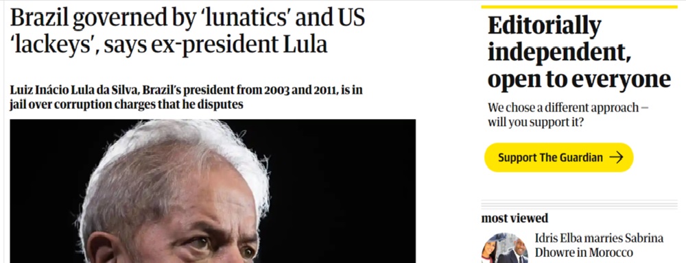 O britânico The Guardian, por exemplo, exibiu na primeira página das edições eletrônicas UK e International com o título “Brasil é governado por ‘lunáticos’ e ‘lacaios’ dos EUA, diz ex-presidente Lula”. Já o francês Le Figaro ressaltou a “obsessão” de Lula, a quem chama de ícone da esquerda, de provar sua inocência, ainda que custe a própria liberdade.