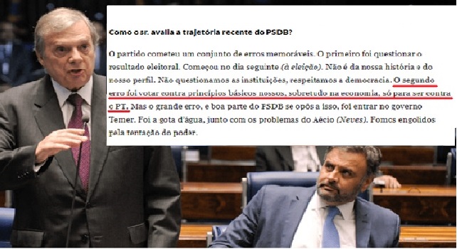 Não precisa nem explicar a frase do senador cearense. Ele, um dos parlamentares mais respeitados do partido, deixou claro que o PSDB votou matérias que vão contra os princípios do partido só para ser contra o PT. Ou seja, Tasso confessa que seu partido boicotou o país (pois os projetos dizem respeito ao Brasil, não ao Partido dos Trabalhadores) só para ser contra a situação.