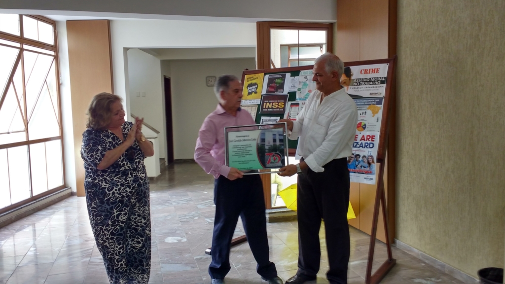 Hoje, foi realizada uma pequena cerimônia com a entrega de uma placa de agradecimento pelo papel de José Geraldo, na história do Sindicato. Também, foi nomeada a sede da Entidade para Edifício José Geraldo Moreira Leite, a qual teve o seu terreno adquirido e seu início de construção, na época de sua gestão.