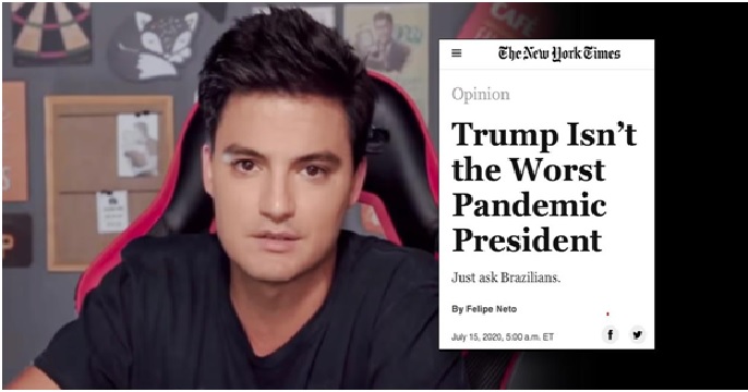 O youtuber Felipe Neto declarou no jornal estadunidense The New York Times, em vídeo publicado nesta quarta-feira (15), que “os presidentes Trump e Bolsonaro há muito admiram os estilos cáusticos de governança. Portanto, não deve ser surpresa que os Estados Unidos e o Brasil sejam os únicos dois países do mundo com mais de um milhão de casos confirmados de Covid-19″.