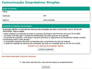 Antes de optar pela suspensão, analise se ela é realmente necessária. Lembre-se: o Empréstimo Simples foi concebido para ser liquidado em um prazo determinado na sua contratação. Logo, quando ocorre a interrupção do pagamento de prestações, o saldo fica desequilibrado, já que continua a ser corrigido sem que haja amortização de prestação, podendo gerar um resíduo ao final do contrato que será refinanciado em até seis meses.