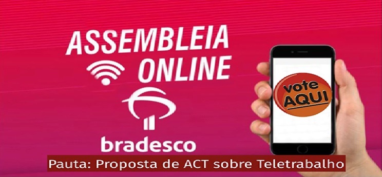 Será aberta às 8 horas e prosseguirá até às 18 horas, de segunda (21), a Assembleia Geral Extraordinária online dos funcionários do Bradesco, convocada pelo Sindicato dos Bancários de Ponte Nova e Região, para votação, deliberando teletrabalho no pós pandemia. A Assembleia será realizada de forma virtual, obedecido quórum previsto nos Artigos 612 e 859 da CLT.