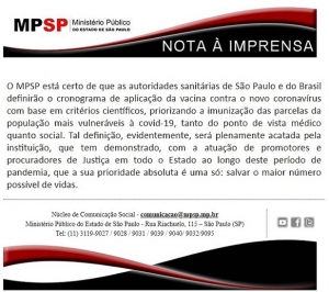 Nota do Ministério Público de São Paulo sobre o pedido de prioridade dos promotores para o recebimento da vacina contra o coronavírus / MP-SP