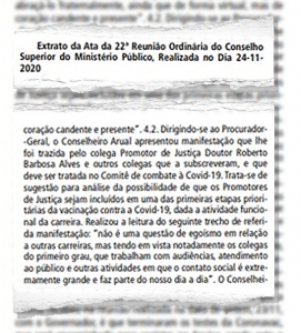 “Dirigindo-se ao Procurador-Geral, o Conselheiro Arual apresentou manifestação que lhe foi trazida pelo colega Promotor de Justiça Doutor Roberto Barbosa Alves e outros colegas que a subscreveram, e que deve ser tratada no Comitê de combate à Covid-19. Trata-se de sugestão para análise da possibilidade de que os Promotores de Justiça sejam incluídos em uma das primeiras etapas prioritárias da vacinação contra a Covid-19, dada a atividade funcional da carreira.