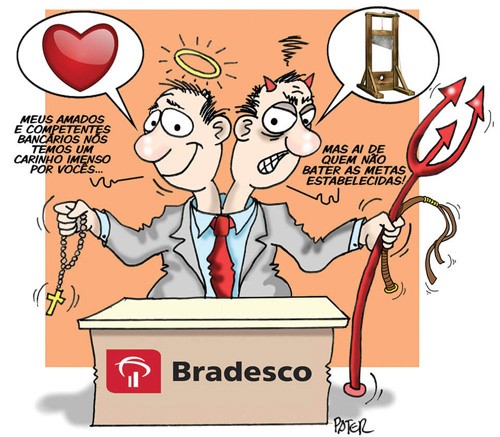 “Todas as diretorias regionais querem ficar bem com a diretoria executiva. Então, pressionam além das metas para que estejam bem colocadas no ranking. Essa pressão se reflete nas áreas abaixo c omo gerências regionais e agências. É uma pressão que vem de cima e se transfere para todas as áreas subordinadas. Sabemos de diretorias que estão exigindo 130% em todos os indicadores. Não é algo pontual. É uma situação generalizada no Bradesco”, relata o diretor do Sindicato de SP e bancário do Bradesco, Alexandre Bertazzo.
