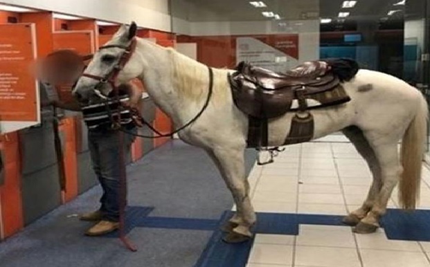 A imagem do cavalo na área dos caixas eletrônicos viralizou na internet. O animal aparece ao lado do dono, enquanto ele está no caixa eletrônico.