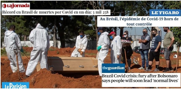 Antes mesmo da divulgação do balanço de 3 mil mortos, o site do canal francês de rádio e televisão FranceInfo dizia, na terça-feira, que o cenário brasileiro era preocupante. A emissora insiste que mais de 3 mil pacientes esperam uma vaga nos serviços de cuidados intensivos, que a variante brasileira é mais contagiosa, que a campanha de vacinação não avança e que a estratégia de Bolsonaro é criticada. O site retomou uma declaração feita por Michael Ryan, da OMS, que chamava a atenção para o impacto internacional da crise no Brasil e resume: “o país se tornou uma bomba relógio para o resto do mundo”.