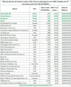 Do total de instituições analisadas pela Economática, 45 possuem ativos totais superiores a US$ 100 bilhões. É neste grupo que a consultoria concentrou seu levantamento. Ele é composto por 19 bancos dos Estados Unidos, seguidos por Brasil, Canadá e Reino Unido (quatro bancos cada); Japão e Coreia (três bancos cada), Espanha e Índia (com dois bancos cada).