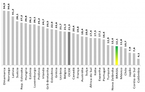 Gráfico 1 – Empregados públicos em relação ao total de trabalhadores, 2013 (em porcentagem) Fonte: OECD (2015). Government at a Glance 2015. OECD Publishing: Paris.