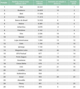 Confira o ranking das 25 Marcas Brasileiras mais Valiosas em 2019: