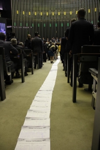 A lista do abaixo assinado, levado ao Congresso pela bancada de deputados do PSOL, era tão grande que teve que ser aberta e espalhada pelo chão do plenário da Câmara dos Deputados, onde ocorreu a sessão. (…)