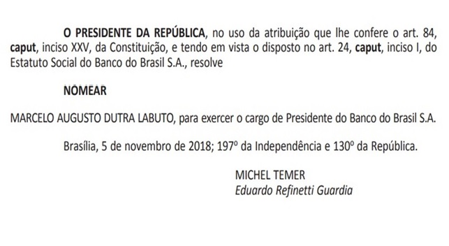 A nomeação de Marcelo Labuto como novo presidente do Banco do Brasil é assinada pelo presidente Michel Temer e pelo ministro da Fazenda, Eduardo Guardia.