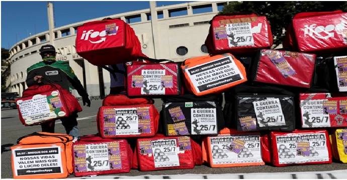Pela segunda vez no mês, entregadores de aplicativos de diversas cidades do Brasil promoveram uma paralisação nacional para pedir melhores condições de trabalho. O movimento, batizado de breque dos apps, em alusão a empresas como iFood, Uber Eats e Rappi, pede um reajuste no valor recebido por entrega feita, seguro contra acidentes durante a jornada laboral e fim dos bloqueios injustificados pelos aplicativos, que impedem que eles consigam aceitar novas entregas. Apesar de não terem vínculos trabalhistas, eles também pedem para ser reconhecidos como funcionários e não como empreendedores, forma como são tratados pelas principais empresas do setor. Os aplicativos afirmam que implementaram seguros para garantir a segurança dos trabalhadores durante a pandemia e negam ter baixado taxas neste período, uma das queixas dos manifestantes.
