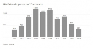 O país registrou no primeiro semestre deste ano o menor número de greves desde 2011, em meio à pandemia do coronavírus. Segundo dados do Dieese (Departamento Intersindical de Estatística e Estudos Socioeconômicos) divulgados em primeira-mão à Folha, foram realizadas de janeiro a junho 354 paralisações, contra 577 em igual período de 2019, numa queda de 39%.