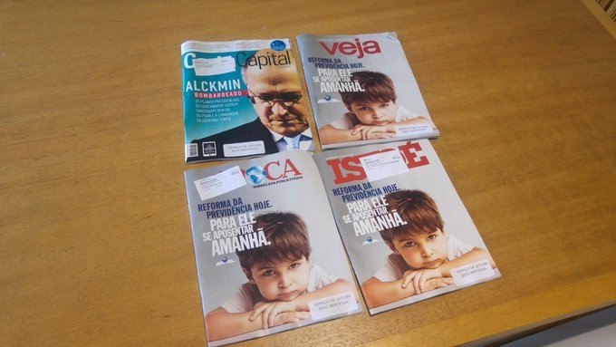 A última edição de três das quatro principais revistas semanais brasileiras, VejaÉpoca e IstoÉ, exibem uma interessante coincidência nas capas, tomadas por uma propaganda do governo federal em defesa da reforma da Previdência. A econômica Istoé Dinheirotambém foi às bancas com a capa publicitária.