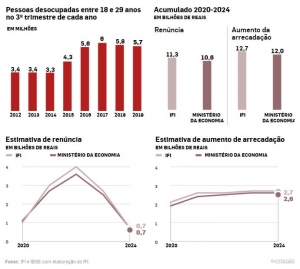A IFI chama atenção que a meta de 1,8 milhão de novos empregos, projetada pelo governo, representa quase metade (47%) do universo de 3,7 milhões de jovens entre 18 anos e 29 anos que podem ser beneficiados pelo programa. O Primeiro Emprego, no governo Lula, programa similar ao proposto agora, gerou 30 mil vagas em três anos.