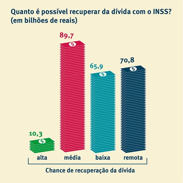 Apenas R$ 10,3 bilhões (4% do montante da dívida) têm alta probabilidade de recuperação, segundo estudo da procuradoria divulgado em março do ano passado. Do classificado à época, referente à R$ 375 bilhões de dívidas, constatou-se que 38% têm média chance de recuperação; 28% tem baixa chance e 30% tem chances remotas (veja detalhes no quadro abaixo).
