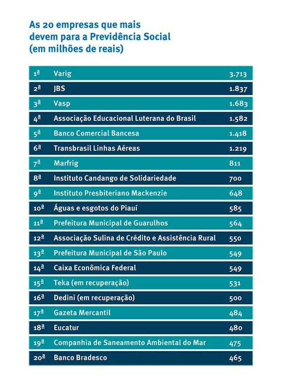Na lista das empresas devedoras da Previdência, há gigantes como Bradesco, Caixa Econômica Federal, Marfrig, JBS (dona de marcas como Friboi e Swift) e Vale. Apenas essas empresas juntas devem R$ 3,9 bilhões, segundo valores atualizados em dezembro do ano passado.